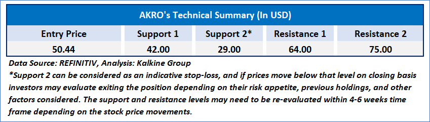 AKRO's current stock price experienced a significant surge in a single day, suggesting the potential for a near-term consolidation and gap-filling. The 14-day Relative Strength Index (RSI) has entered overbought territory, indicating the possibility of a pullback to ease momentum. However, the 50-day Simple Moving Average (SMA) remains below the current stock price, providing an additional layer of support that could contribute to a more positive outlook for the stock.