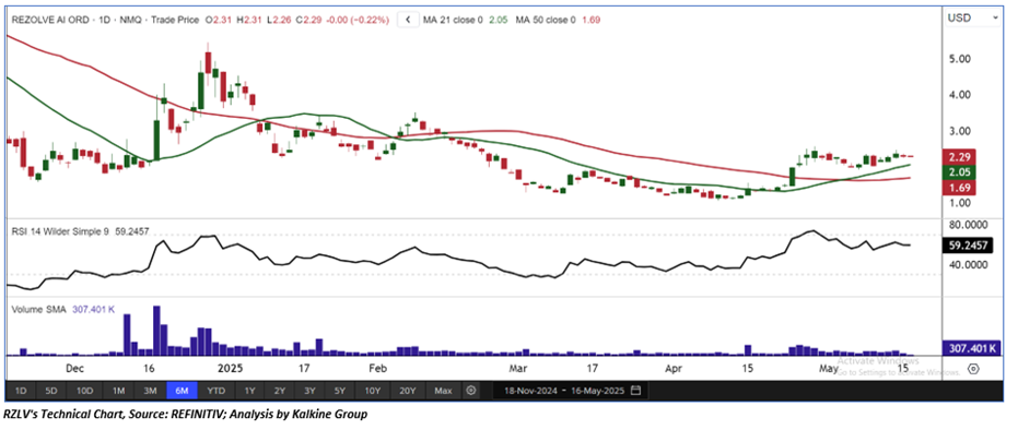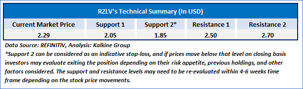 RZLV's stock price showed resilience at lower levels and steadily advanced, reinforced by a golden crossover of key moving averages on the daily chart, suggesting potential for near-term gains. The 14-period RSI is climbing above the midpoint, indicating positive sentiment and increased buying interest. Furthermore, the stock is trading above both its 21-day and 50-day Simple Moving Averages, which bolsters the outlook for continued upward movement in the short term. These moving averages are expected to serve as support levels in the near future.