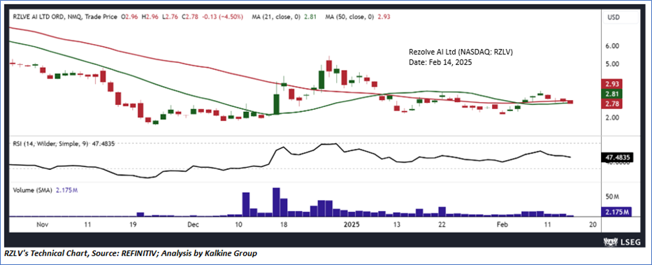 As per the above-mentioned price action, recent key business and financial updates, momentum in the stock over the last month, and technical indicators analysis, a ‘Speculative Buy’ rating has been given to Rezolve AI Ltd (NASDAQ: RZLV) at its current market price of USD 2.78 as of Feb 14, 2025 (7:40 am EST).