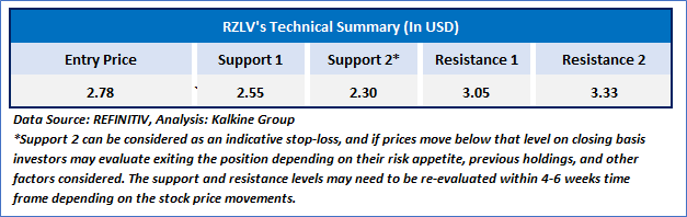 RZLV's stock is consolidating within a tight range while holding key support levels, potentially signaling a reversal and creating an opportunity for upward movement. The 14-day Relative Strength Index (RSI) is currently below 50, hinting at a possible positive turnaround. Additionally, the 21-day Simple Moving Average (SMA) is positioned below the stock price and may act as immediate support in the near term.