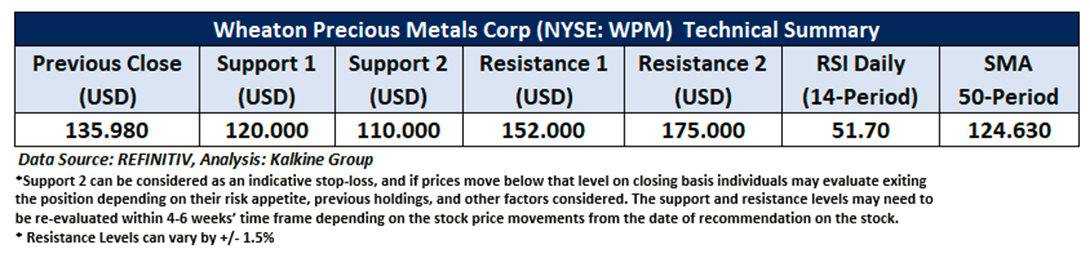On the daily chart, WPM is trading above its rising trendline support, reflecting solid underlying price structure. The 14-period RSI near 51.70 indicates recovering momentum and stabilisation around neutral levels. The stock also holds above its 50-period SMA, which continues to act as dynamic support and limits downside risk. Immediate support is seen near USD 120, while resistance around USD 152 defines the near-term trading range.