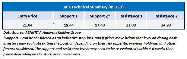 IX's stock is demonstrating resilience at lower levels and has begun to rise, suggesting the potential for an upward reversal in the near term. The 14-day Relative Strength Index (RSI) is turning upward from lower levels, further supporting a positive outlook. Additionally, the stock is currently intersecting both its 21-period and 50-day Simple Moving Averages (SMAs), which may serve as support levels in the near term. If the price can sustain above these levels, it could attract further buying interest.