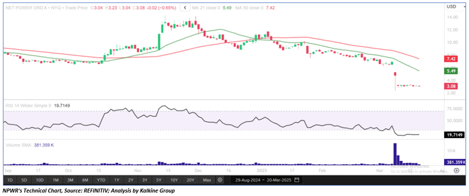 NPWR's stock price has experienced a significant decline and is currently hovering around key support levels, which may lead to a sell imbalance that could result in potential short-term gains. The 14-day Relative Strength Index (RSI) is in oversold territory and might see an upward movement. However, the stock price remains below its 21-period Simple Moving Average, which could serve as a resistance zone in the near term.