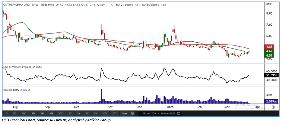 As per the above-mentioned price action, recent key business and financial updates, momentum in the stock over the last month, and technical indicators analysis, a ‘Speculative Buy’ rating has been given to QuantumScape Corporation (NYSE: QS) at its current market price of USD 4.67 as of March 24, 2025 (8:15 am PDT).