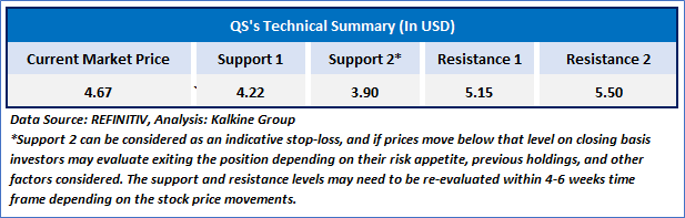 QS's stock price has found support at critical levels and has started to rise, indicating a possible upward reversal. The 14-day Relative Strength Index (RSI) is turning around from lower levels, suggesting it may move towards the midpoint. Additionally, although the stock is currently trading below its 50-period simple moving average, it appears to be on track for a recovery and potential retracement to these levels in the near term.