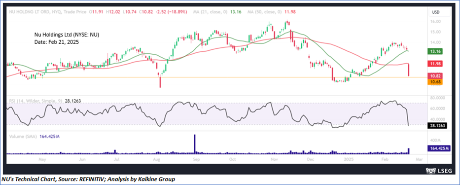 NU's stock price is currently hovering near key horizontal trendline support levels, suggesting a potential for an upside reversal in the near term. The 14-day Relative Strength Index (RSI) is nearing oversold territory, indicating a possible rebound. However, the stock is presently trading below its 21-period and 50-period Simple Moving Averages (SMAs), which may act as immediate resistance levels. If the price can regain these levels, it may draw increased buying interest.