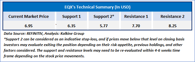 EQX's stock price is currently close to its rising trendline support levels, indicating the potential for further upward movement. The 14-day Relative Strength Index (RSI) is above the midpoint, reinforcing a positive outlook for the stock. Furthermore, the stock is trading above its 50-period simple moving average, which is expected to act as a support level in the near term as price fluctuations occur.