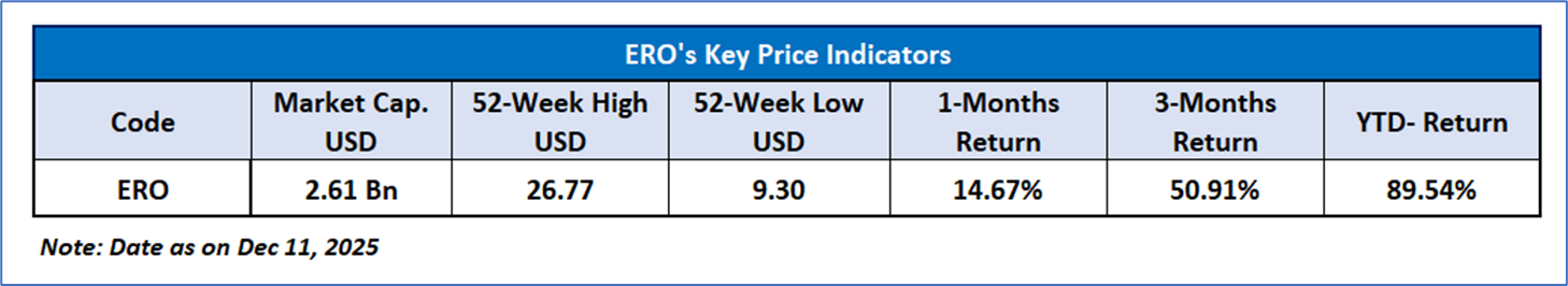 Ero Copper Corp. (NYSE: ERO) engages in the exploration, development, and production of mining projects in Brazil. Its flagship asset includes Caraíba operations that comprise the production and sale of copper concentrates located in northeastern Bahia State, Brazil, as well as gold and silver produced and sold as by-products.