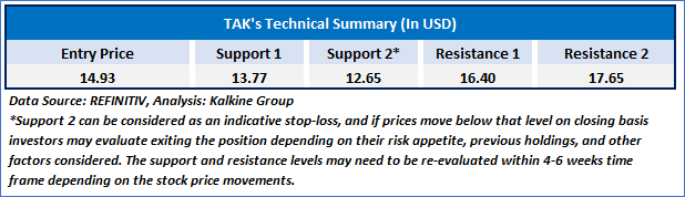 TAK's stock is experiencing a significant uptrend following a healthy correction, suggesting the possibility of continued upward movement in the near term. The 14-day Relative Strength Index (RSI) is trending upward, further reinforcing a positive outlook. In addition, the stock is trading above both its 21-period and 50-day Simple Moving Averages (SMAs), which will serve as support levels in the short term and further bolster the positive sentiment.