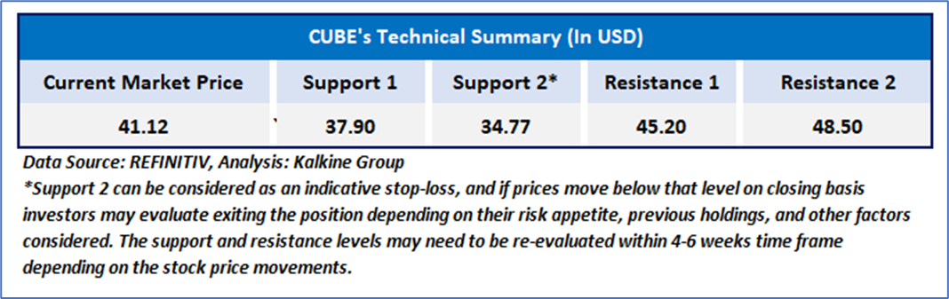 CUBE's stock price has established firm support at key levels and is gradually rising, suggesting the possibility of additional gains in the near term. The 14-period RSI is also moving above the midpoint, indicating a bullish bias. Additionally, the stock has reclaimed its 21-period simple moving average, which may act as a short-term support level. Overall, these technical indicators point to a higher probability of an upward trend, provided the price stays above these important support zones.