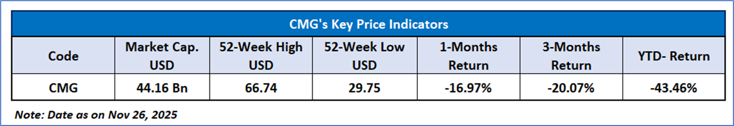 Chipotle Mexican Grill, Inc. (NYSE: CMG) is a restaurant company. The Company develops and operates restaurants that serve a menu of burritos, burrito bowls, quesadillas, tacos, and salads, made using fresh ingredients. The Company operates approximately 3839 restaurants in the United States, Canada, the United Kingdom, France, Germany, Kuwait, and United Arab Emirates.