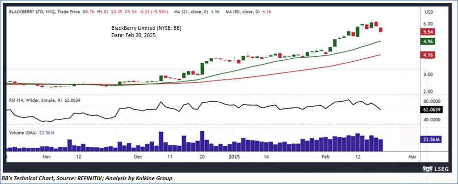 As per the above-mentioned price action, recent key business and financial updates, momentum in the stock over the last month, and technical indicators analysis, a ‘Buy’ rating has been given to BlackBerry Limited (NYSE: BB) at its current market price of USD 5.54 as of Feb 20, 2025 (12.25 am EST).