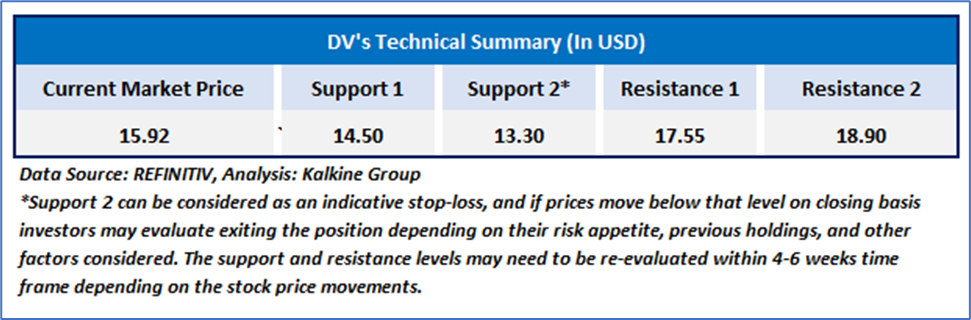 DV's stock price has maintained its upward trend over the past few months, indicating the potential for further upside movement in the near term. Additionally, the 14-period RSI is rising above the midpoint, further supporting a positive outlook. Moreover, the stock is trading above both its 21-day and 50-day simple moving averages, which strengthens the bullish sentiment. Overall, these technical indicators point to a higher likelihood of continued gains, provided the price stays above these key support levels.