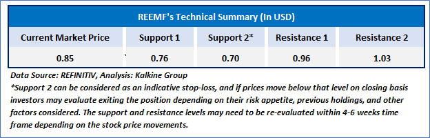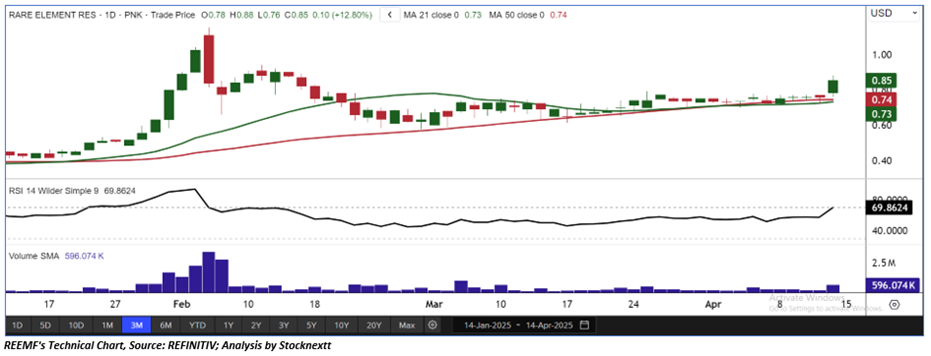 As per the above-mentioned price action, recent key business and financial updates, momentum in the stock over the last month, and technical indicators analysis, a ‘Speculative Buy’ rating has been given to Rare Element Resources Ltd. (OTC: REEMF) at its current market price of USD 0.85 as of April 14, 2025 (8:20 am PDT).