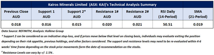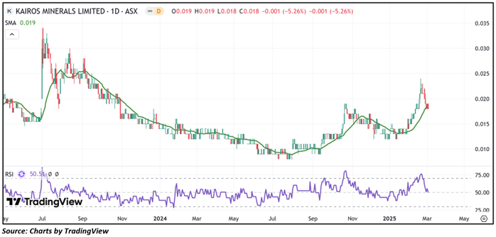 Considering the stock’s current price levels forming higher peaks and higher troughs, and momentum oscillator analysis, a “Speculative Buy” recommendation is given on the stock. The stock was analysed as per the closing price of AUD 0.0180 per share as on 04 March 2025, down by 5.26%. Kairos Minerals Limited (ASX: KAI) was last covered in a report dated ’03 August 2023’.