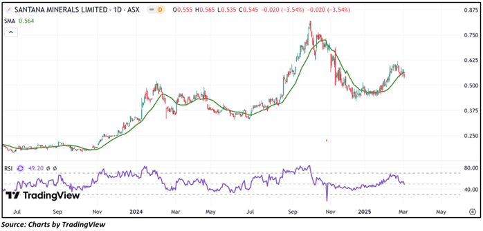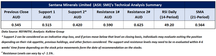 Considering the stock’s current price levels forming higher peaks and higher troughs, and momentum oscillator analysis, a “Speculative Buy” recommendation is given on the stock. The stock was analysed as per the closing price of AUD 0.545 per share as on 04 March 2025, down by 3.54%. Santana Minerals Limited (ASX: SMI) was last covered in a report dated ’13 May 2022’.