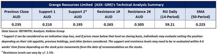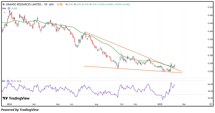 Considering the stock’s current price levels breaking above a descending wedge pattern, and momentum oscillator analysis, a “Speculative Buy” recommendation is given on the stock. The stock was analysed as per the closing price of AUD 0.235 per share as on 07 February 2025, up by 4.44%. Grange Resources Limited (ASX: GRR) was last covered in a report dated ’28 May 2024’.