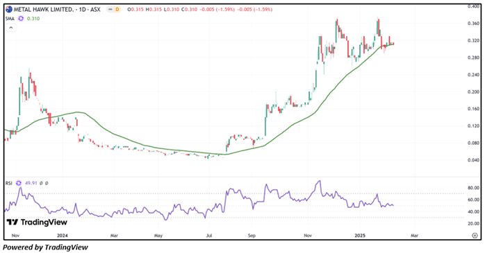 Considering the stock’s current price levels accumulating during an uptrend, and momentum oscillator analysis, a “Speculative Buy” recommendation is given on the stock. The stock was analysed as per the closing price of AUD 0.310 per share as on 07 February 2025, down by 1.59%. Metal Hawk Limited (ASX: MHK) was last covered in a report dated ’20 November 2023’.