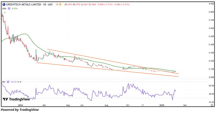Considering the stock’s current price levels breaking above a descending wedge pattern, and momentum oscillator analysis, a “Speculative Buy” recommendation is given on the stock. The stock was analysed as per the closing price of AUD 0.066 per share as on 07 February 2025, down by 5.71%. GreenTech Metals Limited (ASX: GRE) was last covered in a report dated ’29 February 2024’.