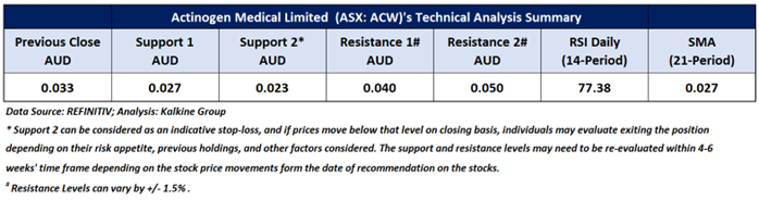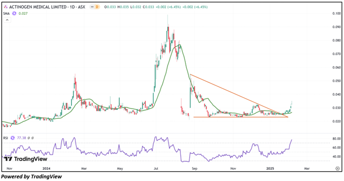 Considering the stock’s current price levels breaking above a downward trendline, and momentum oscillator analysis, a “Speculative Buy” recommendation is given on the stock. The stock was analysed as per the closing price of AUD 0.033 per share as on 06 February 2025, up by 6.45%. Actinogen Medical Limited (ASX: ACW) was last covered in a report dated ’18 March 2021’.