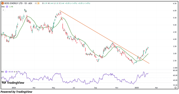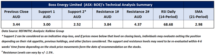 Considering the stock’s current price levels breaking above a downward trendline, and momentum oscillator analysis, a “Speculative Buy” recommendation is given on the stock. The stock was analysed as per the closing price of AUD 3.44 per share as on 06 February 2025, up by 1.47%. Boss Energy Limited (ASX: BOE) was last covered in a report dated ’03 January 2025’.