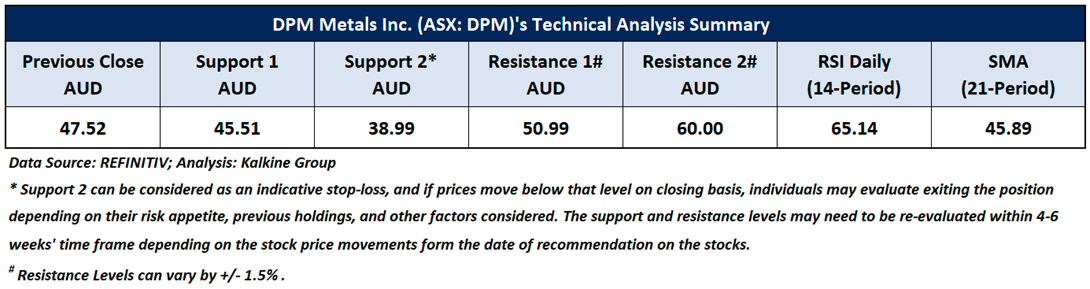 On daily chart, DPM's stock price is undergoing an uptrend characterized by higher highs and higher lows, indicating a positive bias. Additionally, the RSI (14-period) is trading above its midpoint, providing further support for the mentioned recommendation. Prices are trading above both the 21-period and 50-day SMAs, which may potentially function as dynamic support levels for the stock; in contrast, the stock’s most recent high might act as a resistance level. Crucial support for the stock is positioned at AUD 45.51, while key resistance is placed at AUD 50.99.