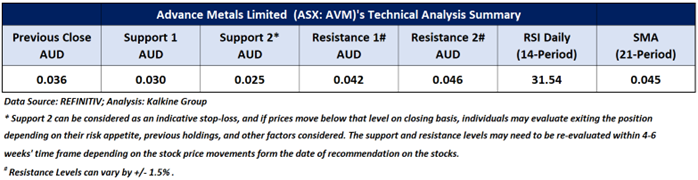 Considering the stock’s current price levels forming a trading range, and momentum oscillator analysis, a “Watch” recommendation is given on the stock. The stock was analysed as per the closing price of AUD 0.036 per share as on 08 April 2025, down by 2.70%.