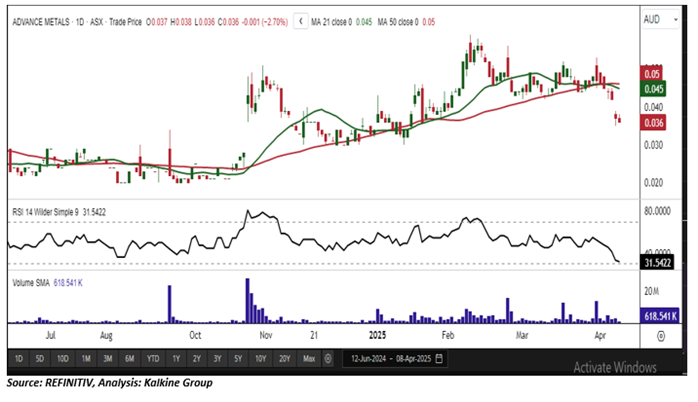 Considering the stock’s current price levels forming a trading range, and momentum oscillator analysis, a “Watch” recommendation is given on the stock. The stock was analysed as per the closing price of AUD 0.048 per share as on 08 April 2025, up by 6.67%.