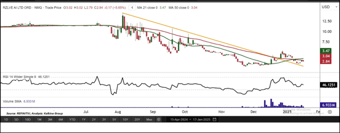 On the daily chart, RZLV's prices are trading above the descending trendline resistance zone, while also holding above a key horizontal support level. Moreover, the 14-period Relative Strength Index (RSI) is at 54.54, suggesting neutral to slightly bullish momentum, the prices are trading below the trend-following indicator 21-period SMA, which may act as a resistance level. An important support level for the stock is seen at USD 2.40 and USD 2.00, while the key resistance level is placed at USD 3.28 and USD 3.70.