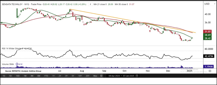 On the DAILY, ST's prices are trading below the descending trendline support zone. Moreover, the momentum oscillator RSI (14-period) is showing a reading of ~42.47 level. However, the prices are trading below the trend-following indicator 21-period SMA, which may act as a resistance level. An important support level for the stock is seen at USD 25.10 and USD 21.50, while the key resistance level is placed at USD 31.80 and USD 35.20.