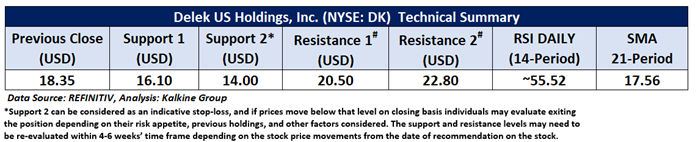 On the daily chart, DK's stock is trading above both the horizontal trendline support zone and the descending trendline support level, indicating a positive outlook. The 14-period Relative Strength Index (RSI) is at 55.52, suggesting neutral to slightly bullish momentum. Prices are also above both the 21-period and 50-period Simple Moving Averages (SMA), which may act as support levels. Key support levels are at USD 16.10 and USD 14.00, while resistance is seen at USD 20.50 and USD 22.80.