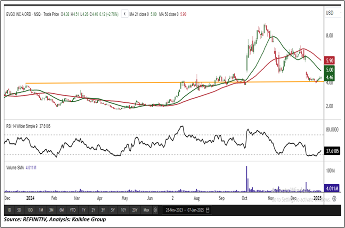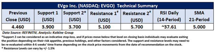 On the daily chart, EVGO prices are trading above the upward sloping trendline support zone. Moreover, the momentum oscillator RSI (14-period) is showing a reading of ~37.61 level. However, the prices are trading below the trend-following indicator 21-period SMA, which may act as a resistance level. An important support level for the stock is placed at USD 3.90, while the key resistance level is placed at USD 5.10.
