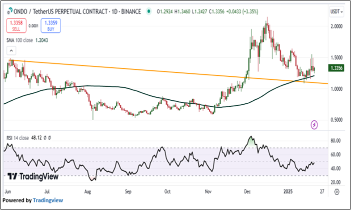 On the daily chart, ONDO prices are sustaining above the falling trendline support level, indicating an upside movement. Moreover, RSI (14-period) is moving in a positive zone and showing a reading of ~48.12 level, indicating positive price momentum. Further, the CMP is moving above the trend following indicator 100-period SMA, which may act as the support level. An important support level for the crypto is placed at USD 1.140, while the key resistance level is placed at USD 1.530.