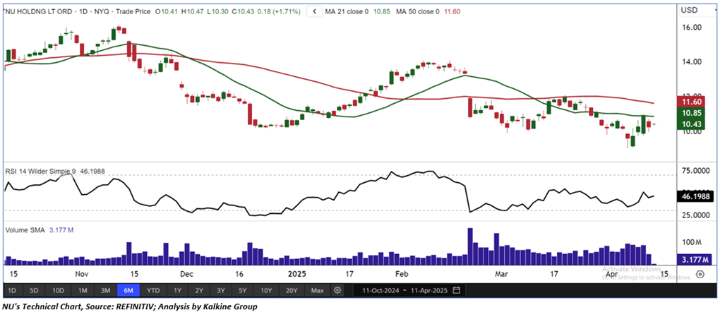 Nu Holdings Ltd (NYSE: NU) is a Brazil-based holding company, which engages in the provision of digital banking services. The Company offers its customers products across the five financial seasons: spending, saving, investing, borrowing, and protecting. As per our previous US Dailies report published on ‘NU’ on 24th Feb 2025, Kalkine provided an ‘Buy’ stance on the stock at USD 10.82 based on technical analysis and the stock price has now moved down by ~3.60% since then.