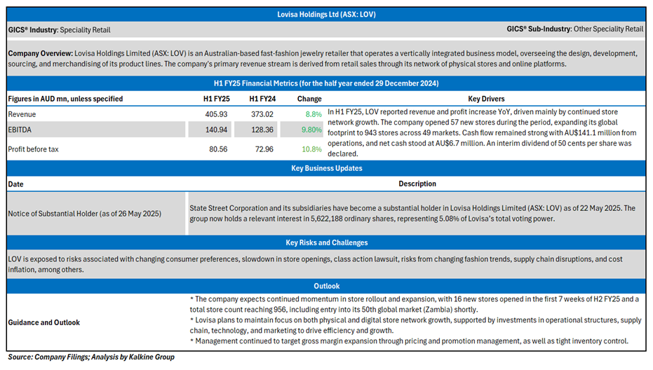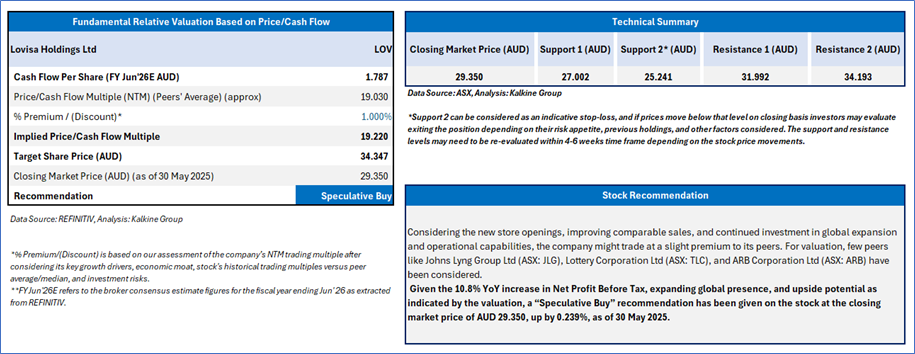 Section 2.0: Lovisa Holdings Ltd (‘Speculative Buy’ at AUD 29.350, closing market price per share as on 30 May 2025)