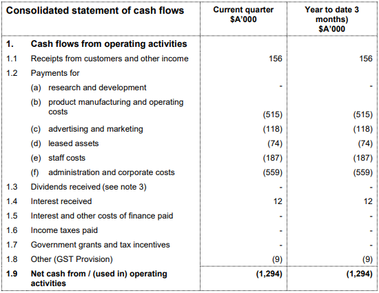 September’19 Quarter Key Highlights:Net cash outflow from operating activities was reported at $1,294,000. Net cash outflow from financing activities for the period was reported at $1,000. Cash and cash equivalents at end of quarter was reported at $2,131,000..png)