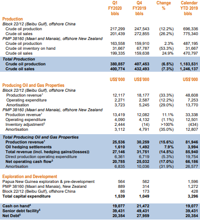 What to expect:Company started FY20 with decent September quarter performance, and with continued strong production at Maari, driven by the successful water injection program, the joint venture has initiated life extension studies planning for the Maari facilities to produce late into the next decade. With the assumption of continuation of momentum of current production and oil prices, the company is well positioned to achieve its targeted net cash position by mid of CY20, with continued reduction in debt during FY20.