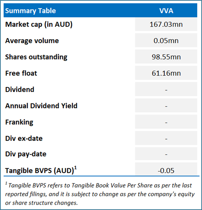 VVA is an Australia-based vertically integrated health and fitness company. The Company operates a portfolio of brands across various fitness categories, offering premium, boutique, flexible, and affordable fitness options.