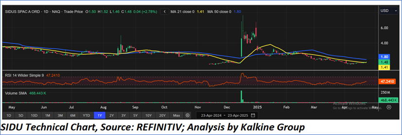 SIDU is showing early signs of a potential trend reversal, with the price recently moving above the 21-day moving average (USD 1.41) and the RSI trending upward at 47.24, indicating improving momentum. However, the stock remains below the 50-day moving average (USD 1.80), which serves as a key resistance level. After a sharp spike and decline between December 2024 and January 2025, the stock appears to be stabilizing and consolidating near USD 1.40. A breakout above USD 1.80 with strong volume could confirm a bullish reversal, while failure to hold current levels may signal continued weakness.