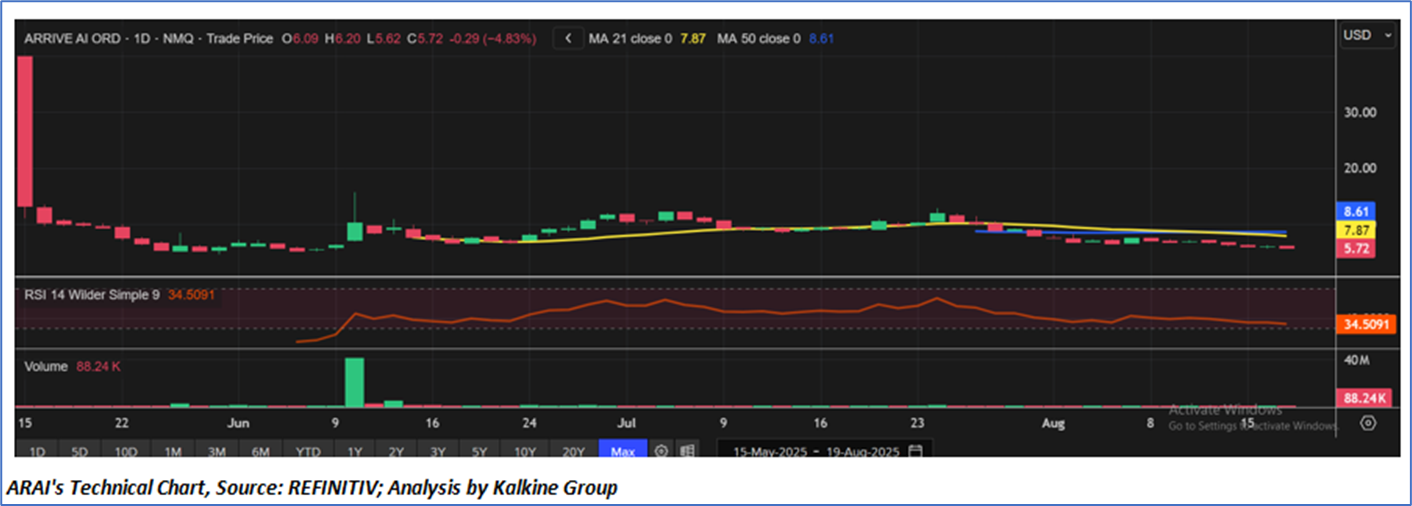 The chart of Arrive AI ORD shows a persistent downtrend, with the stock trading at USD 5.72, well below its 21-day (USD 7.87) and 50-day (USD 8.61) moving averages. Momentum remains weak as the RSI (34.5) hovers just above oversold, while low trading volume reflects limited investor interest.