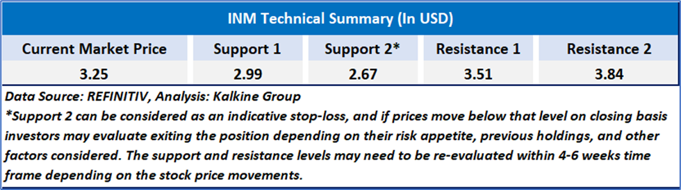 INM has shown largely flat price movement over the past year, with occasional sharp spikes likely driven by news or speculative activity. The stock is currently trading at USD 3.25, slightly above its 21-day and 50-day moving averages, indicating mild short-term bullishness. The RSI at 55.2 reflects neutral to slightly positive momentum, while a recent volume increase to 60.4K suggests rising investor interest. Overall, the trend appears stable with signs of periodic volatility.