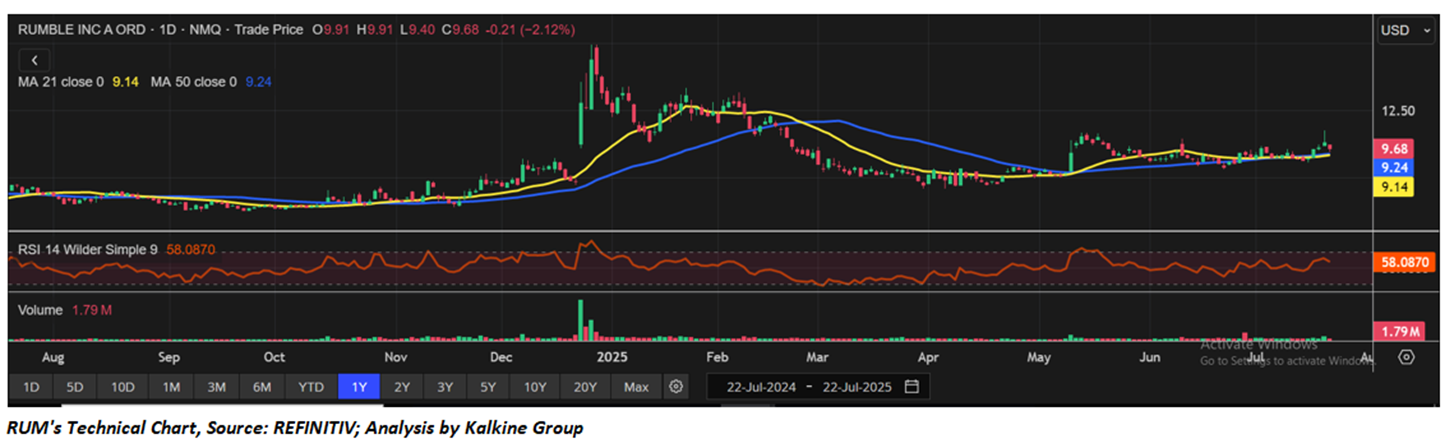 Rumble Inc. is showing early signs of bullish momentum, with the stock trading above both its 21-day and 50-day moving averages, supported by a recent bullish crossover. The RSI at 58 suggests moderate strength without being overbought, while volume remains steady.