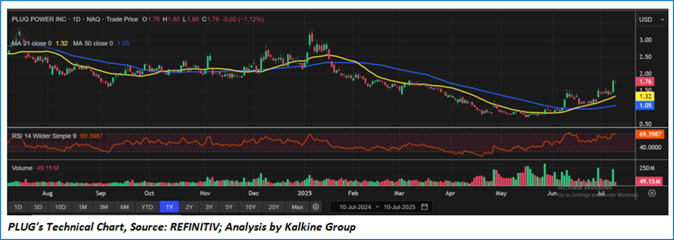 Plug Power Inc. (PLUG) is showing a bullish technical setup, with the stock trading above its 21-day and 50-day moving averages, which have recently formed a bullish crossover. Strong volume and a rising RSI near 70 indicate solid buying momentum, although the stock may face short-term resistance around USD 2.00.