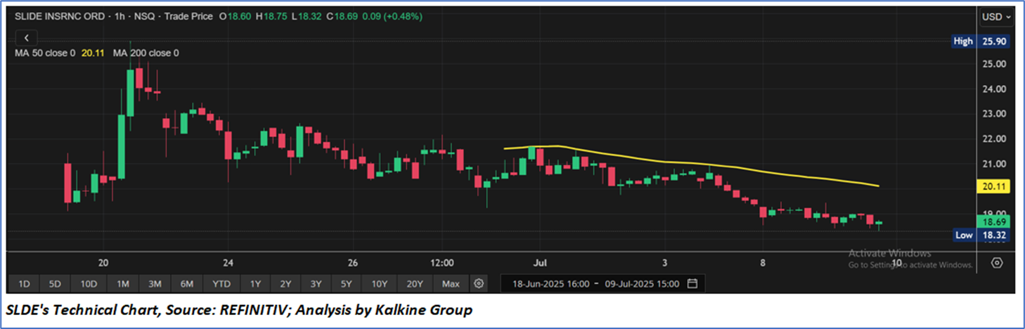 Slide Insurance Group, Inc. (Nasdaq: SLDE), launched in 2021 and incorporated in Delaware, operates as a technology-enabled specialty insurer through its subsidiary, Slide Insurance Company (SIC), focusing on underwriting single-family and condominium policies in coastal P&C markets along the Atlantic seaboard, particularly in Florida and South Carolina, where it leverages a USD 6 trillion TIV dataset and proprietary technology to assess risks and acquire profitable policies via inorganic block transactions, independent agents, and a direct-to-consumer channel. The company has grown shareholders’ equity from USD 102 million in 2021 to USD 433 million by December 31, 2024, with in-force premiums reaching USD 1,334 million and a consolidated combined ratio averaging 80.3%, though it reported a net income of USD 93 million for the three months ended March 31, 2025, amidst a competitive landscape and reliance on a robust reinsurance program providing USD 3.17 billion in coverage effective June 1, 2025. SLDE offered 16,666,667 shares with estimated net proceeds of USD 252.0 million, Slide faces challenges including its limited operating history, regulatory hurdles, and market volatility, while planning expansion into excess & surplus markets and additional coastal regions.