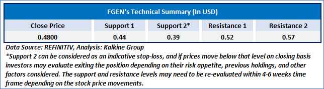 FGEN's stock has faced resistance at crucial levels and has experienced a decline, suggesting a potential consolidation phase with a bearish outlook. The 14-day Relative Strength Index (RSI) is presently below the midpoint, further reinforcing the negative sentiment at these levels. Additionally, the stock is nearing the point of dropping below its 50-period simple moving average, which would further bolster the negative bias.