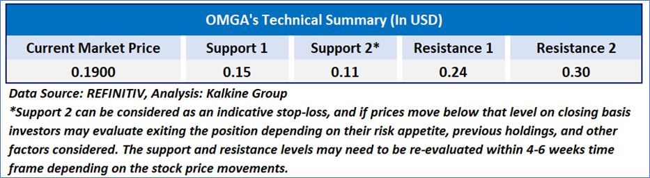 The Relative Strength Index (RSI) over a 14-day period stands at a value of 29.12, currently downward trending and inside oversold zone, with expectations of a consolidation or an upward momentum if USD 0.26, 0.28 is broken on the upside. Additionally, the stock's current positioning is below both the 50-period SMA and 200-period SMA, which may serve as dynamic short to medium-term resistance levels.