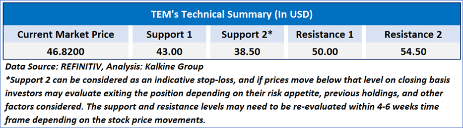 The Relative Strength Index (RSI) over a 14-day period stands at a value of 38.71, near oversold levels, with expectations of a consolidation or a further continuation towards downside if USD 45.00-USD 50.00 resistance levels hold. Additionally, the stock's current positioning is below 50-Day SMA which can act as a short to medium term resistance.
