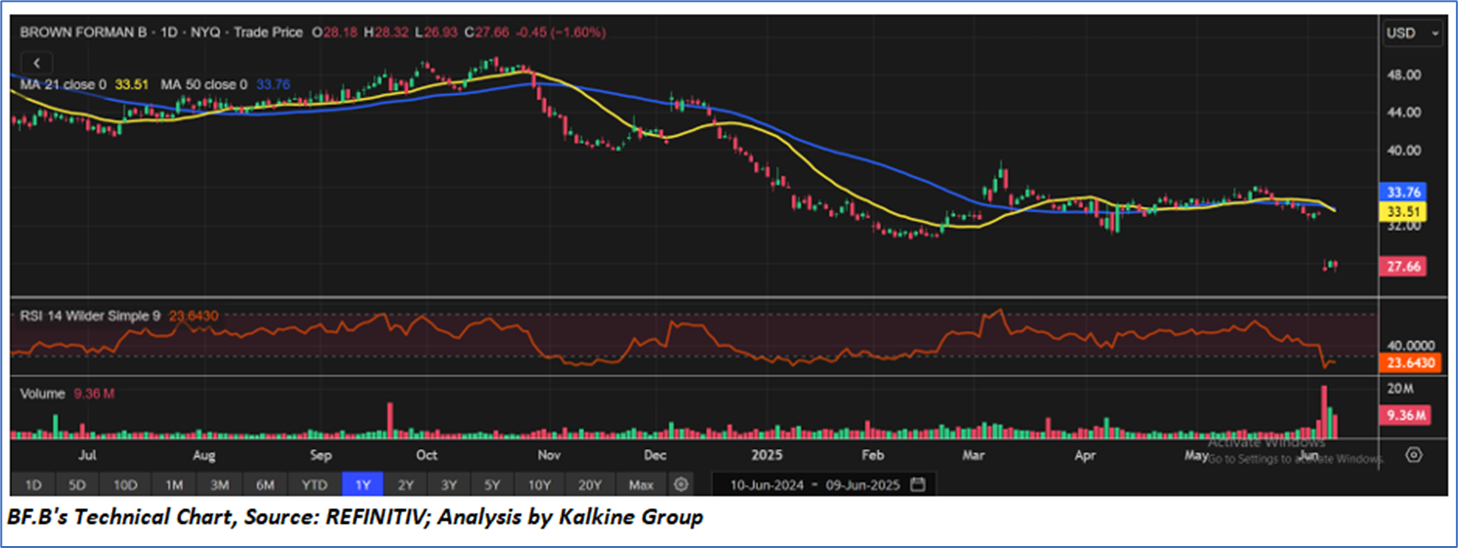 BF.B remains in a clear downtrend, with the stock recently breaking sharply lower to USD 27.66, well below its 21-day and 50-day moving averages. The RSI at 23.64 indicates deeply oversold conditions, though strong bearish momentum persists. A sharp spike in volume suggests possible capitulation selling following recent news or earnings.