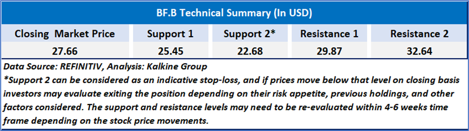 As per the above-mentioned price action, recent key business and financial updates, momentum in the stock over the last month, and technical indicators analysis, a ‘Watch’ rating has been given to Brown-Forman Corporation (NYSE: BF. B) at the closing market price of USD 27.66 as of Jun 09,2025.