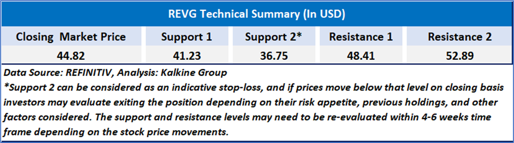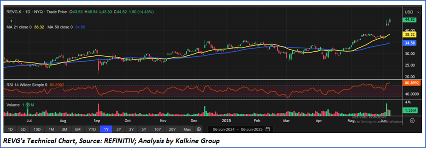 The chart for REVG shows a strong bullish trend, with the stock recently breaking out above prior resistance near USD 40, supported by rising 21-day and 50-day moving averages. The breakout is validated by a significant volume spike, indicating strong buying interest. However, the RSI at 80.89 signals overbought conditions, suggesting potential for short-term consolidation.